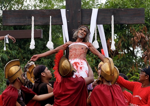 Một người đàn ông Philippines bị đóng đinh vào thập tự giá, cùng hơn 10 người nữa đi theo, trong lúc những người đàn ông chân trần tự đánh vào người trong Thứ sáu Tuần thánh. Đây là màn trình diễn đẫm máu của những người mộ đạo tại Philippines.