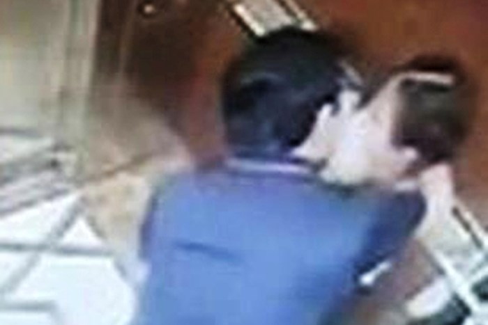 Người này ôm bé gái vào lòng, hôn tới tấp. Sau khi cửa thang máy mở ra, bé gái hoảng sợ bỏ chạy và trượt chân suýt té.