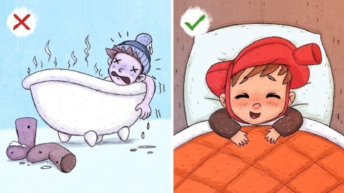 Bạn đừng bao giờ chà xát các khu vực bị bỏng lạnh vì điều này có thể gây tổn thương mô trầm trọng hơn. Việc dùng nước nóng hoặc đèn sưởi để sưởi ấm nạn nhân cũng không nên. Những cách điều trị này có thể gây sốc cho cơ thể nạn nhân. Thay vào đó, bạn nên làm ấm phần trọng tâm của cơ thể dần dần, tốt nhất là bằng cách quấn chăn và đặt một số chai nước ấm kẹp vào nách của họ.