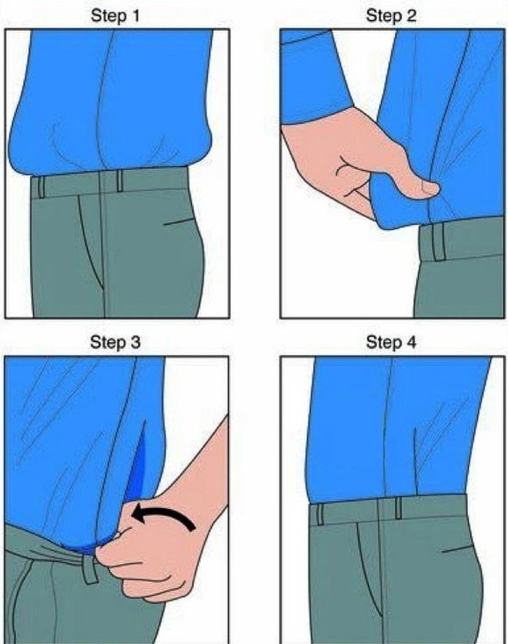 Để tránh tình huống này, chúng ta có một mẹo nhỏ: chỉ cần gấp nhẹ phần áo ở phần hông trước khi cho vào quần là ổn ngay.