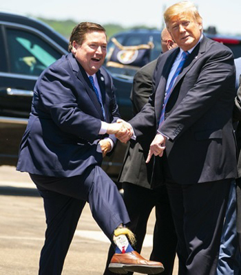 Phó thống đốc Louisiana Billy Nungesser (trái) mang tất in hình khuôn mặt và mái tóc của Trump khi đón Tổng thống hôm 14/5. Ảnh: Reuters.
