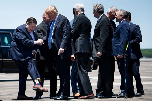 Tổng thống Mỹ Donald Trump hôm 14/5 tới thăm bang Louisiana để trao đổi về vấn đề cơ sở hạ tầng năng lượng của Mỹ. Khi ra đón và bắt tay Tổng thống, Phó thống đốc bang Billy Nungesser lập tức kéo ống quần, khoe đôi tất in hình khuôn mặt và mái tóc vàng đặc trưng của Trump. Ông chủ Nhà Trắng chỉ tay vào đôi tất và tỏ ra hài lòng với hành động của Nungesser.