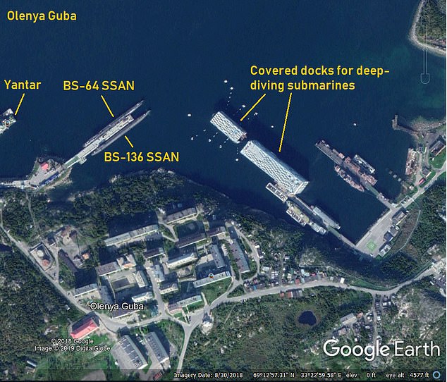 Hình ảnh vệ tinh đăng tải trên Daily Mail cho thấy hải quân Nga có thể đã đưa một bầy cá voi tới căn cứ Olenya Guba, trên biển Barents nằm ở phía Tây Bắc nước này vào thời điểm con cá voi được phát hiện.