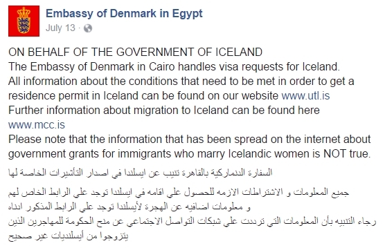 Thậm chí, Đại sứ quán Đаn Mạсh tại thủ đô Cairo, Ai Cập – đơn vị thay mặt chính quyền đảo quốc Iceland phụ trách công tác xét duyệt đơn xin cấp Visa đã lập tức đăng một thông báo khẩn nhằm “bóc phốt” thông tin sai sự thật nói trên.