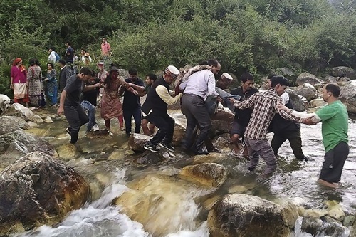 Người dân đưa thi thể và người bị thương rời hiện trường tai nạn ở huyện Kullu chiều 20/6. Ảnh: AFP.