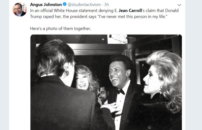 One note: In a new statement from Trump in response to E. Jean Carroll, he claims that he has never met Carroll, but the article includes a photo of "Carroll, Donald and Ivana Trump, and Carroll's then-husband, television-news anchor John Johnson, at an NBC party around 1987."
