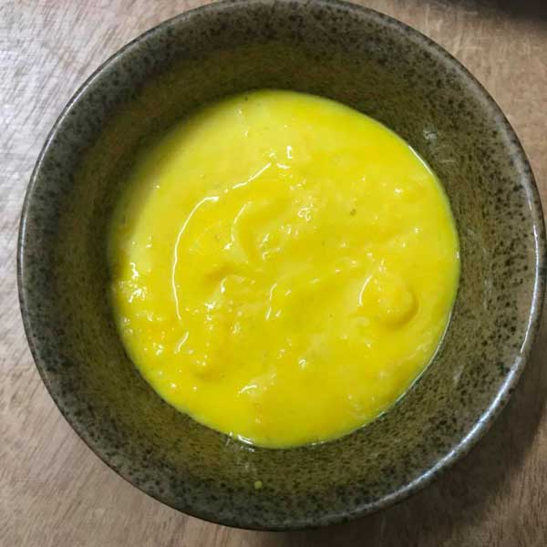 Nghệ xay cùng với mẻ tạo ra hỗn hợp mẻ nghệ, để nghệ giảm bớt mùi hăng, hỗn hợp này nếu để 1-3 ngày sẽ càng làm mất mùi của nghệ (lưu ý chỉ xay một miếng nghệ nhỏ không nên xay nhiều nghệ quá, mình thường cho một bát mẻ với một củ nghệ dài bằng ngón tay trỏ, áng chừng như vậy chứ cũng không dùng hết được).