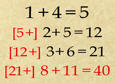 Trong cả chuỗi phép tính th́ chỉ có phép đầu tiên "4+1=5" là logic, c̣n lại đều phi logic và ẩn chứa một quy tắc ngầm. Nếu ta phát hiện được quy tắc này th́ sẽ dễ dàng giải được bài toán.