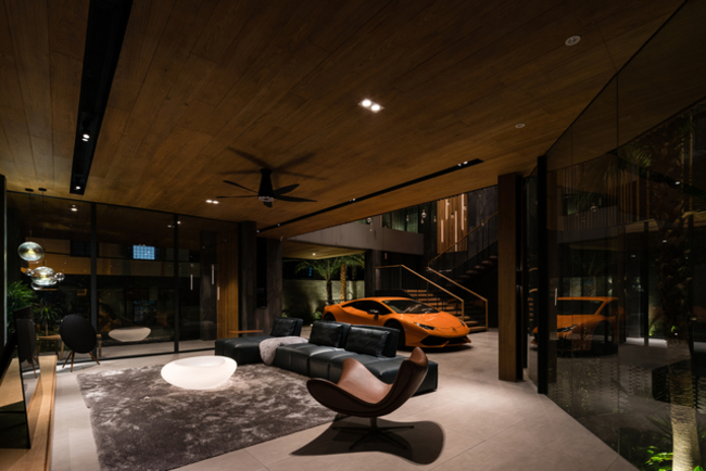 Phòng khách tại tầng 1 là nơi tiếp khách, đồng thời là nơi trưng bày những siêu xe của chủ nhân.