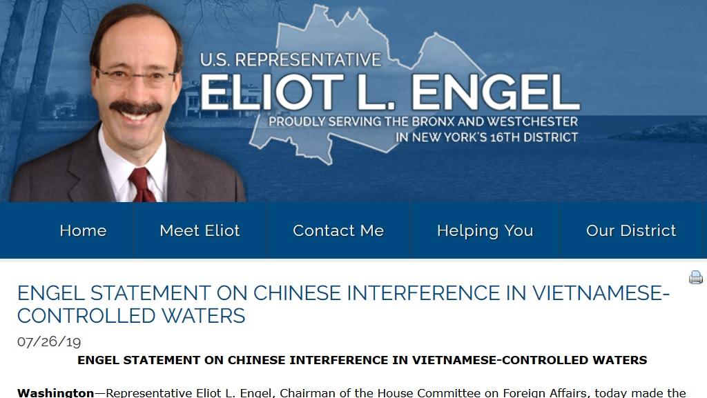 Trong một bản thông cáo về vụ “Trung Quốc can thiệp vào vùng biển do Việt Nam kiểm soát, dân biểu bang New York thuộc đảng Dân Chủ Eliot L. Engel, chủ tịch Ủy Ban Đối Ngoại Hạ Viện Mỹ trước hết ghi nhận rằng: “Hành vị xâm lấn mới đây của Trung Quốc ở Biển Đông là một minh chứng đáng lo ngại về việc một quốc gia công khai chà đạp luật pháp quốc tế”.