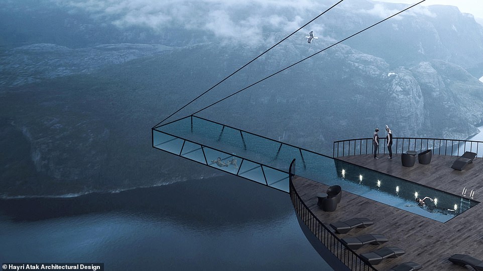 Khách sạn của kiến trúc sư Hayri Atak Studio có hồ bơi bằng kính xuyên thấu, tầm nhìn ra vịnh Lysefjorden được thiết kế nhô hẳn ra ngoài từ một bên của vách đá cao 600m. Tuy nhiên, khách sạn mới thành hình trên giấy, chưa được phép quy hoạch. Ngoài 3 tầng phòng dành cho khách thuê, khách sạn còn có 2 tầng ban công để khách ngắm phong cảnh kỳ vĩ. Đây là tòa nhà duy nhất trên thế giới kết hợp bể bơi vô cực 360 độ.