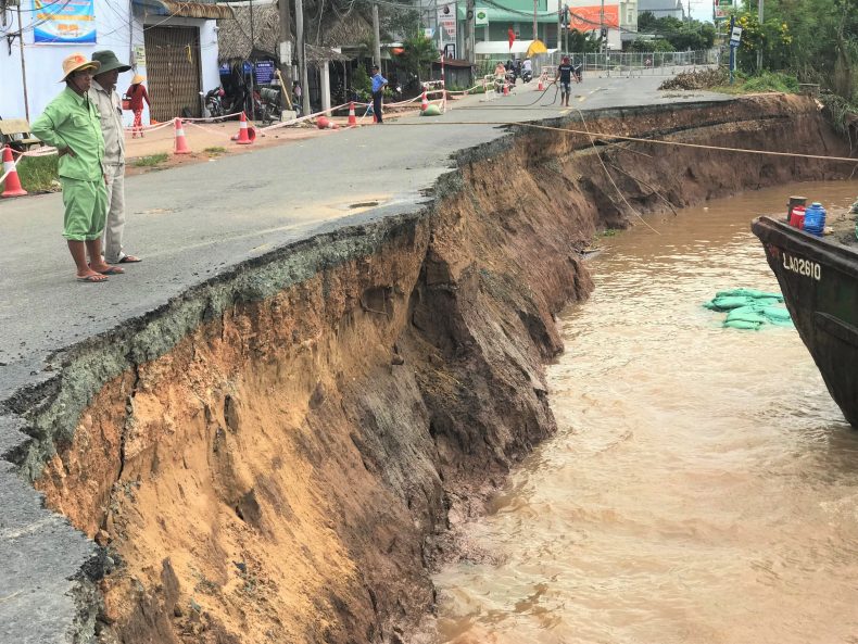 Người dân địa phương quan sát bờ sông bị sạt lở do mực nước thấp ở đồng bằng sông Cửu Long vào tháng 7 năm 2019. Ảnh Trần Văn Tú.