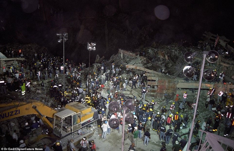 Tình nguyện viên đội mũ cứng và các nhân viên cấp cứu trèo qua các đống đổ nát còn sót lại của Trung tâm Thương mại Thế giới cả ngày lẫn đêm để tìm người sống sót.