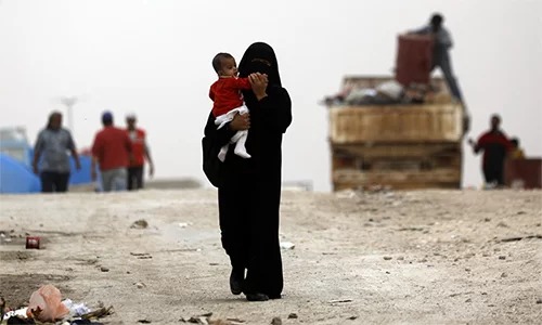 Một phụ nữ bế con tại trại tị nạn Ain Issa, Syria. Ảnh: AFP.