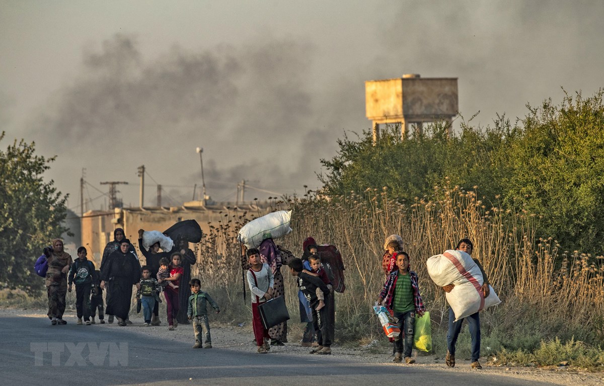Người dân sơ tán tránh chiến sự ở thị trấn Ras al-Ain, tỉnh Hasakeh (Đông Bắc Syria).