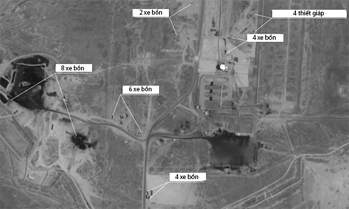 24 xe bồn và 4 thiết giáp tại tỉnh Deir ez-Zor ngày 8/9, Bộ Quốc phòng Nga cho biết có 32 xe bồn ở đây tham gia buôn lậu dầu tại thời điểm vệ tinh chụp ảnh (nhấn vào để xem ảnh lớn). Ảnh: BQP Nga.