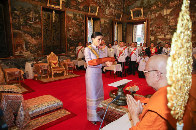 Xuất hiện trong bộ trang phục truyền thống thanh lịch, Hoàng hậu Thái Lan tự tin xuất hiện và chủ trì buổi lễ trước rừng ống kính.