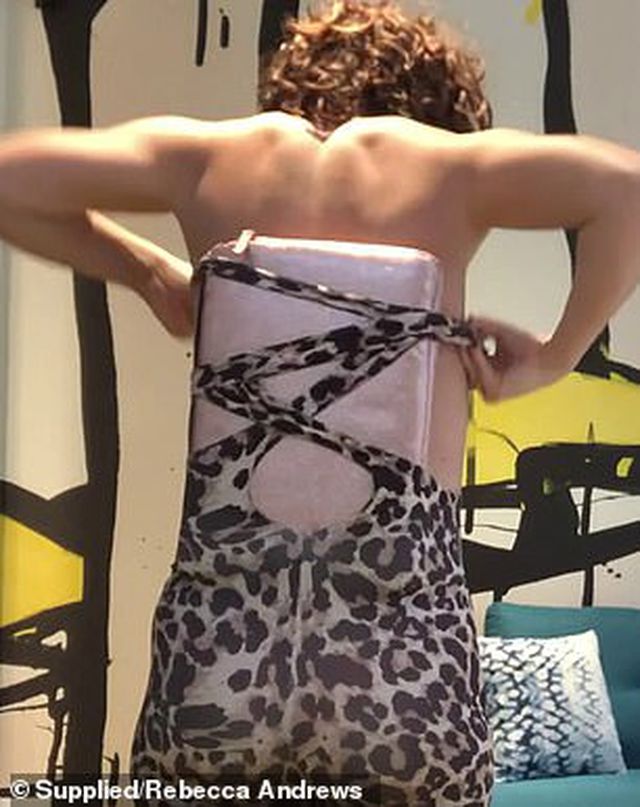 Cô gái Australia mặc bộ đồ liền thân jumpsuit để có thể giữ đồ trên cơ thể. Chiếc máy tính xách tay được cô gái gài sau lưng với đai giữ, bộ sạc cuốn trong quần áo và đặt phía trước như bụng bầu. Tiếp đó, Rebecca mặc thêm quần áo rộng bên ngoài để che “bụng bầu giả”.