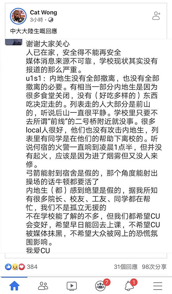 Một sinh viên Đại Lục học tại Đại học Trung văn tiết lộ trên WeChat rằng, không phải toàn bộ sinh viên Đại Lục di tản, và không cần thiết phải như vậy, có số lượng lớn sinh viên rời đi là vì hàng loạt nhà ăn bị đóng cửa nên không có gì để ăn. Nhiều người địa phương rất tốt, không ai tấn công sinh viên Đại Lục, lý do báo cháy đến 1 giờ là vì khói do cảnh sát tung bom cay gây ra mà không ai sửa chữa.