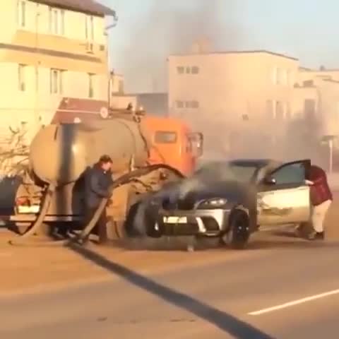 Đáng tiếc, các phương tiện lưu thông trên đường vào thời điểm đó dường như không mang theo bình cứu hỏa dự trữ. Đúng lúc gay cấn, một chiếc xe tải chở phân đi ngang qua. Không còn giải pháp tối ưu hơn, chủ nhân của chiếc xe sang gặp sự cố buộc phải nhờ tài xế xe chở phân phun chất thải dập lửa.