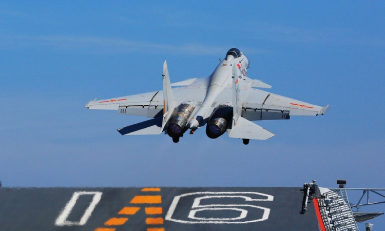 Tiêm kích J-15 cất cánh từ tàu sân bay Liêu Ninh. Ảnh: Sina.