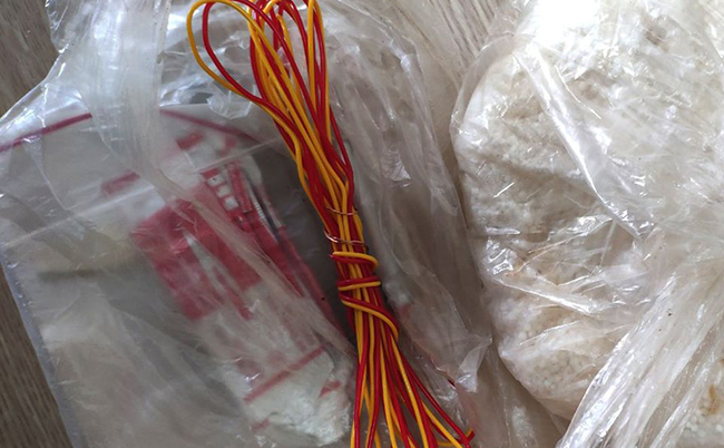 Kiểm tra bên trong, lực lượng chức năng phát hiện có 400 g thuốc nổ dạng muối màu trắng đựng trong túi nylon, một kíp nổ điện, dây dẫn cùng nhiều lưỡi dao mổ, pin dự phòng.
