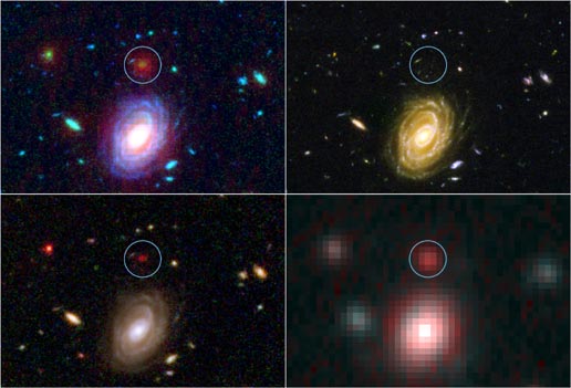 Sự xuất hiện của thiên hà mới HUDF-JD2 dưới các thiết bị quan sát khác nhau của kính viễn vọng Hubble (ảnh: NASA / ESA / JPL-Caltech)