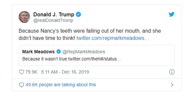 Thượng nghị sĩ Mark Meadows hôm qua đã đăng lại đoạn video bà Pelosi trả lời họp báo trên Twitter với bình luận: "Bởi vì điều này (luận tội ông Trump) là không đúng". Ngay lập tức, ông Trump cũng bình luận phản hồi dòng tweet này: “Bởi vì răng của bà Nancy đã rơi ra, bà ấy không có thời gian để suy nghĩ". Trong đoạn video có khoảnh khắc bà Pelosi đang phát biểu bất ngờ ngừng lại, khẽ nhếch miệng, uống một ngụm nước trước khi tiếp tục trả lời họp báo.