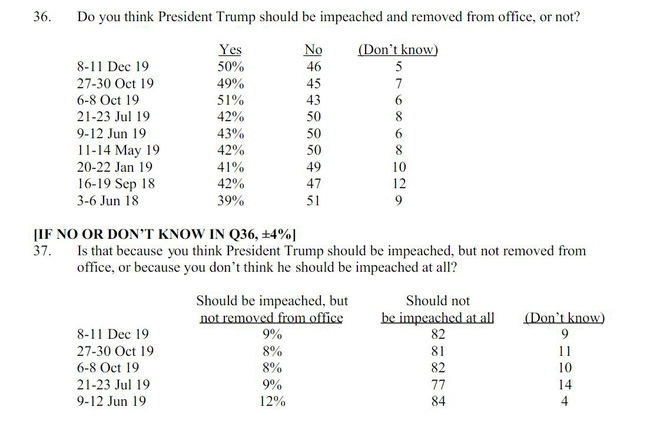 Kết quả thu được không chênh lệch nhiều so với hai lần thăm dò trước đó được thực hiện hồi tháng 10 - khi cuộc điều tra về bê bối điện đàm giữa ông Trump và người đồng cấp Ukraine Vladimir Zelensky được tiến hành.