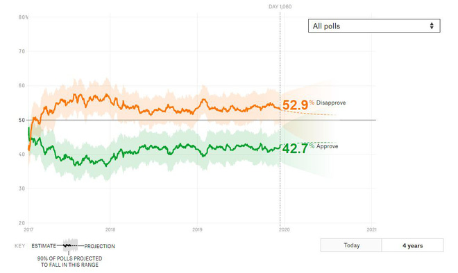 Biểu đồ sự tăng giảm trong tỉ lệ ủng hộ Tổng thống Trump từ năm 2017 - nay. Nguồn: FiveThirtyEight.com