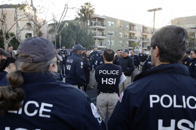 Đặc vụ liên bang Mỹ tập trung trước khi đột kích vào khu phức hợp chung cư cao cấp được cho là nơi ở của các phụ nữ mang thai tới Mỹ sinh con vào năm 2015. Ảnh: AP.