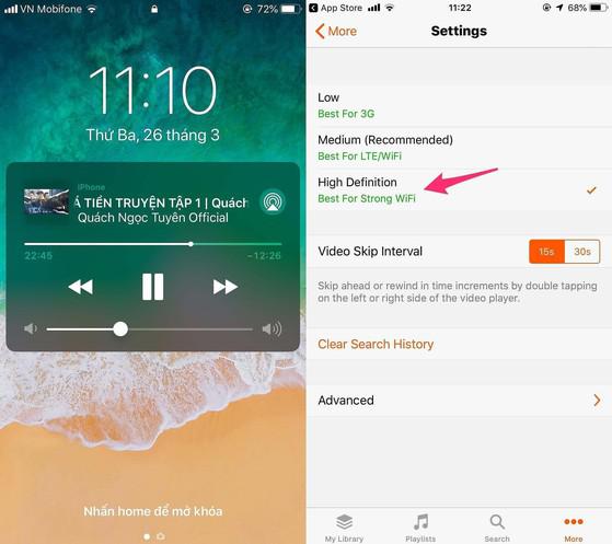 Mặc định Musi sẽ phát video với chất lượng trung bình để tối ưu hóa đường truyền. Nếu đang sử dụng WiFi băng thông rộng hoặc 4G tốc độ cao, bạn nên bấm vào tùy chọn More ở góc phải bên dưới, chọn Settings - High Definition để xem video rõ nét hơn.