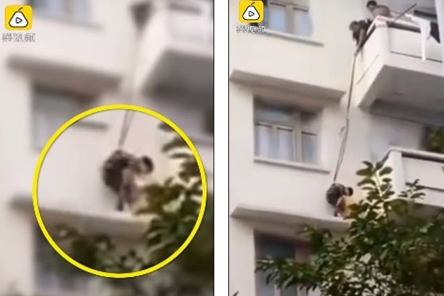 Sự việc xảy ra tại một tòa nhà thuộc tỉnh Tứ Xuyên, Trung Quốc. Đoạn video ghi lại hình ảnh một người phụ nữ lớn tuổi đã buộc dây thừng vào người một cậu bé 7 tuổi và thả từ lan can tầng 5 xuống.