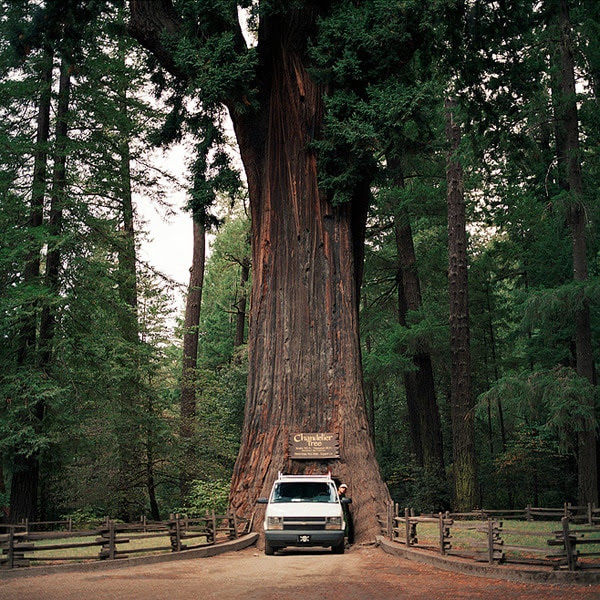 Người ta khoét một cái lỗ khổng lồ xuyên qua thân của cây Tùng bách khổng lồ họ Sequoia sempervirens 2.000 năm tuổi này để thúc đẩy du lịch xe hơi. Có lẽ như vậy vẫn còn tốt hơn là bị chặt hạ để lấy gỗ, vốn là số phận của rất nhiều cây gỗ lớn ở California trong thế kỷ 19.