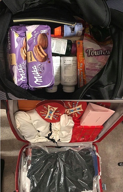 Hai vali quà của chị Trang bao gồm kẹo bánh, mỹ phẩm, rượu. Ảnh: Nhân vật cung cấp.