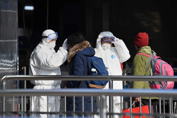 Nhân viên an ninh mặc trang phục bảo hộ kiểm tra thân nhiệt hành khách tại lối vào ga tàu điện ngầm ở Bắc Kinh, Trung Quốc ngày 24/1/2020. (Nguồn: AFP)