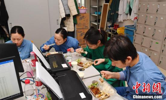 Bữa ăn tranh thủ trong giờ nghỉ trưa của các y tá tại khu vực cách ly của Bệnh viện Nhân dân Thiệu Hưng. Hơn 20 nhân viên y tế đang làm việc tại đây đã không về nhà trong suốt 10 ngày qua.