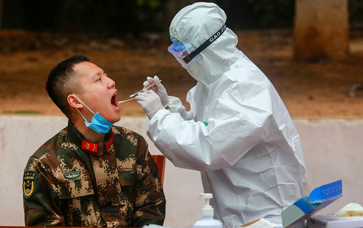 Một nhân viên y tế tiến hành xét nghiệm đối với các sĩ quan cảnh sát bán quân sự Trung Quốc tại Thâm Quyến, Trung Quốc, vào ngày 11 tháng 2 năm 2020. (STR / AFP qua Getty Images)