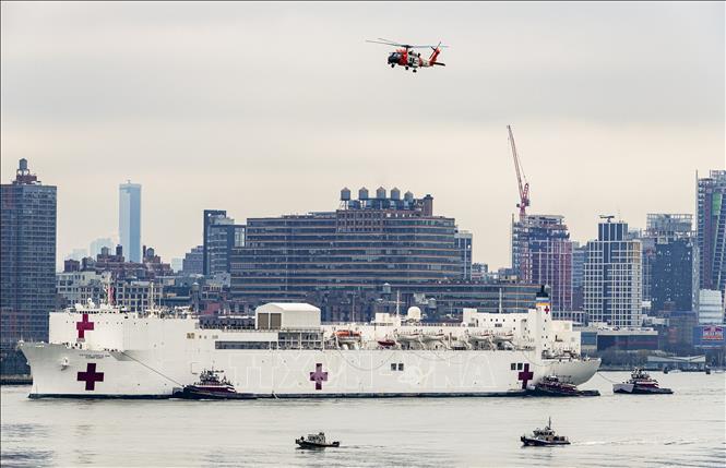 Tàu bệnh viện USNS Comfort cập cảng Manhattan, New York, Mỹ ngày 30/3/2020. Ảnh: THX/TTXVN