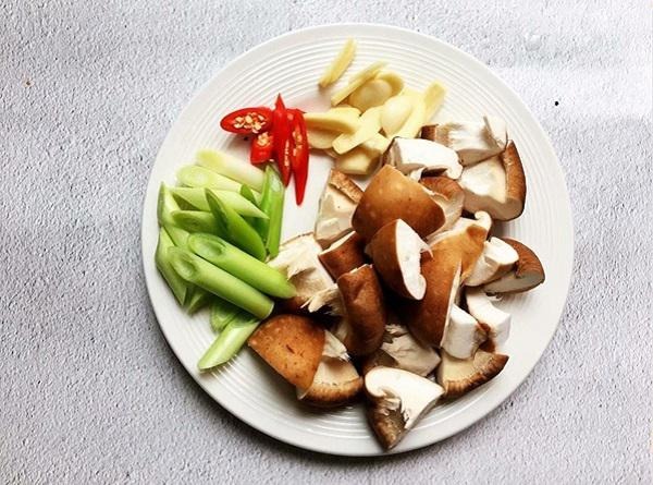 - Bước 2: Nấm hương rửa sạch thái nhỏ; gốc hành thái khúc, tỏi và ớt xắt lát.
