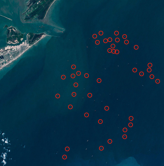 Houston ngày 21/4/2020: Cũng như trước các cảng biển ở châu Âu hay châu Á, trước đường dẫn vào cảng Galveston và Vịnh Trinity trong Vịnh Mexico, có nhiều tàu chở dầu xếp hàng chờ đến lượt bốc dỡ trong các cảng lớn ở Houston hay Texas. Không lâu nữa tại đây sẽ xuất hiện các tàu chở dầu được sử dụng như những kho chứa dầu nổi.