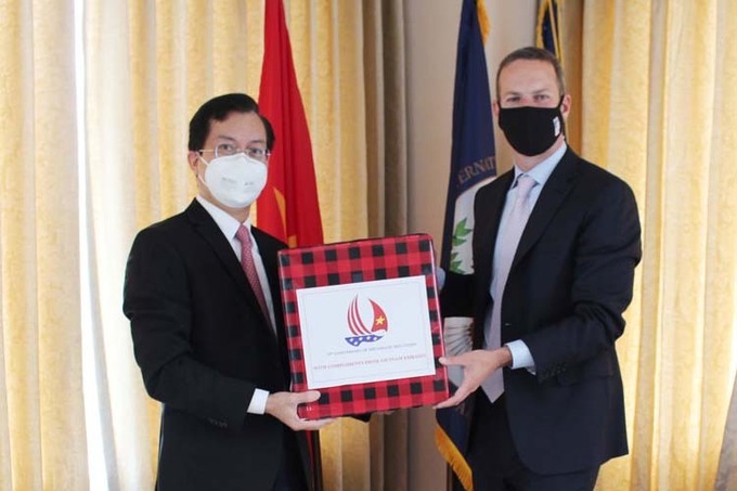 Đại sứ Việt Nam tại Mỹ Hà Kim Ngọc, trái, trao 500 khẩu trang cho ông Boehler để tặng DFC tại thủ đô Washington ngày 2/6. Ảnh: ĐSQVNTM.