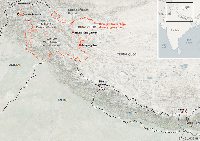 Khu vục biên giới tranh chấp giữa Trung Quốc và Ấn Độ. Đồ họa: NYT.