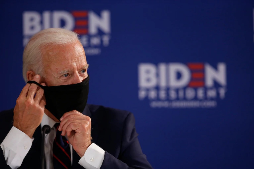 Ứng cử viên tổng thống của đảng Dân chủ Joe Biden điều chỉnh khẩu trang của mình trong hội nghị bàn tròn về mở cửa kinh tế vvào ngày 11/6 tại Philadelphia. Ảnh: AP.