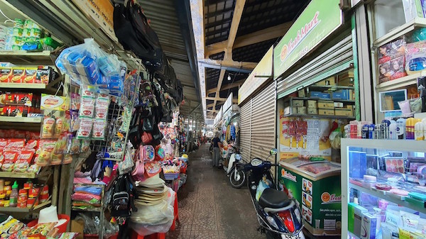 Khác hẳn với cảnh tấp nập bên ngoài, đi sâu vào phía trong chợ là các quầy đồ khô, tạp hóa, quần áo, giàu dép... vắng bóng khách, chủ yếu là tiểu thương đeo khẩu trang ngồi nói chuyện với nhau hoặc tranh thủ ăn sáng. Đi hết một vòng phía trong chợ, tôi chỉ gặp chừng chục khách đi mua cá khô và vài món đồ linh tinh.