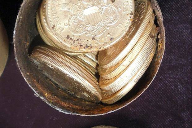 Trước mắt cả hai là tám hũ kim loại chứa đầy những đồng xu bằng vàng. Những đồng xu cổ mà hai vợ chồng nói trên đào lên đã được các chuyên gia về đồng xu cổ thẩm định. Theo báo Los Angeles, ông David Hall, một người sáng lập dịch vụ phân loại đồng xu chuyên nghiệp đã xác nhận có tất cả 1.427 đồng tiền vàng với niên đại từ năm 1847 đến năm 1894.