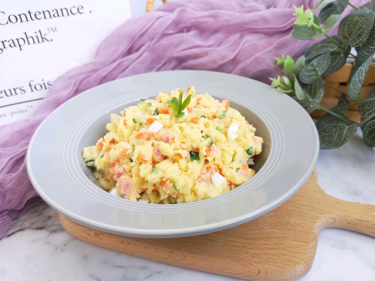 Khoai tây sau khi hấp thì nghiền nát, thêm lòng đỏ trứng vào trộn đều. Thêm sốt salad vào trộn chung.