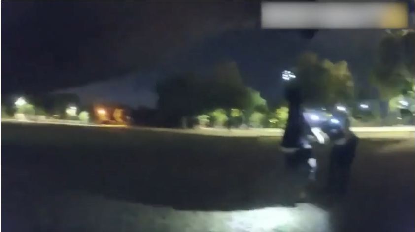 Camera gắn thân cho thấy, nghi phạm không làm theo yêu cầu giơ tay lên. Anh ta cố bước lại gần nữ cảnh sát thì trúng đạn súng điện ngã ra đất. Nhưng chỉ vài giây sau, người này lại cầm dao, tiếp tục xông về phía nữ cảnh sát.