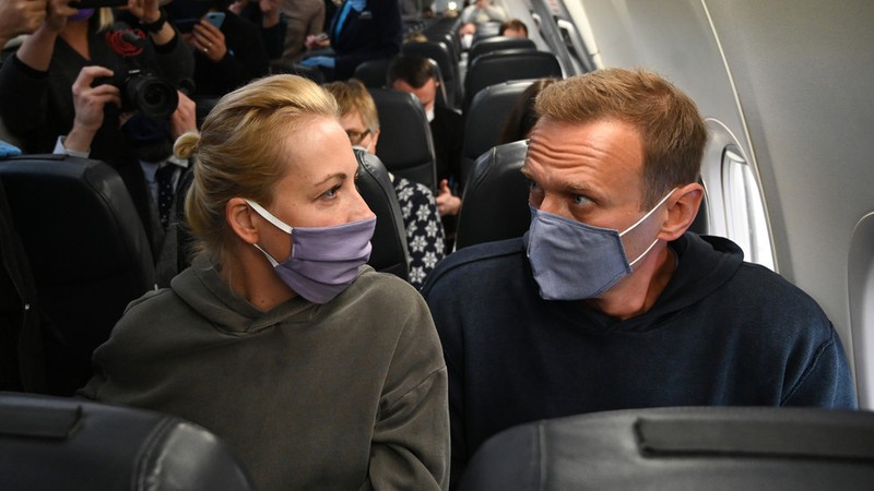 Nhà hoạt động đối lập Alexei Navalny và vợ Yulia trên chuyến bay từ Đức trở về Nga. Ảnh: AFP