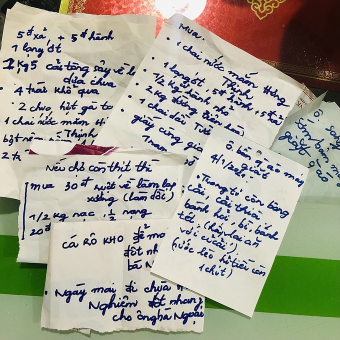 "Ông mua đường cát ở tiệm khác đừng mua của Hạnh nữa, để nó nói làm nữa hả? Ông đi ăn hủ tiếu chay ở tiệm đồ chay kế cây xăng đi cho ngon. Ông xem còn cá cho Su không thì mua. Tờ này ở nhà xem thôi". Đây là một trong những tờ hướng dẫn đi chợ mà bà Nguyễn Thị Đức, 66 tuổi, viết cho chồng từ tối hôm trước để hôm sau ông đi chợ cho "đỡ quên".